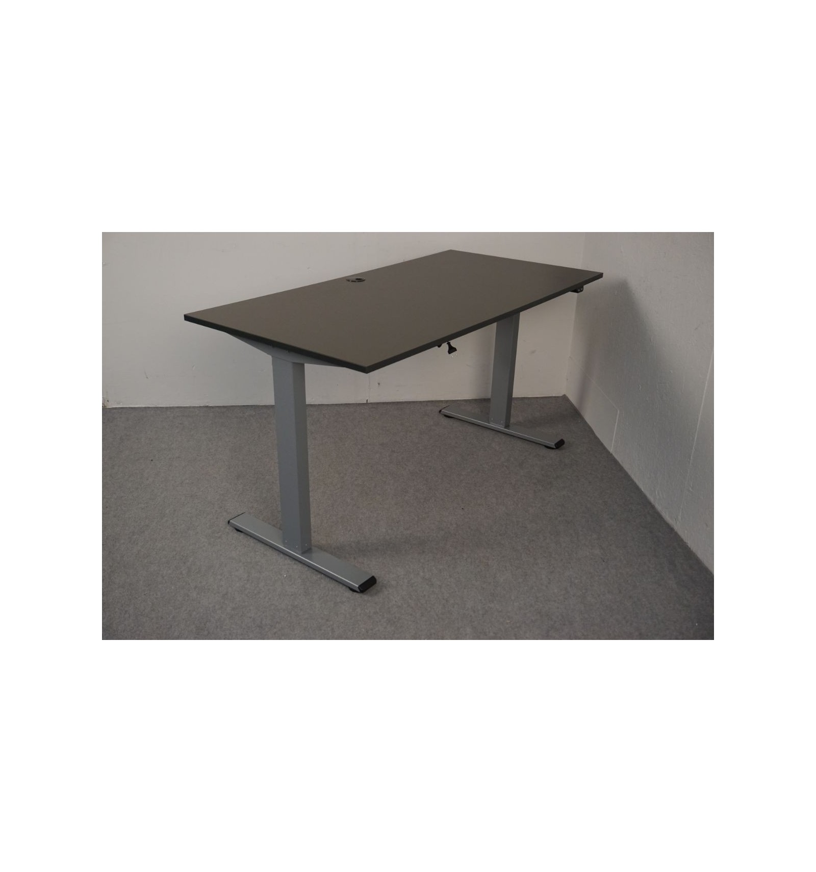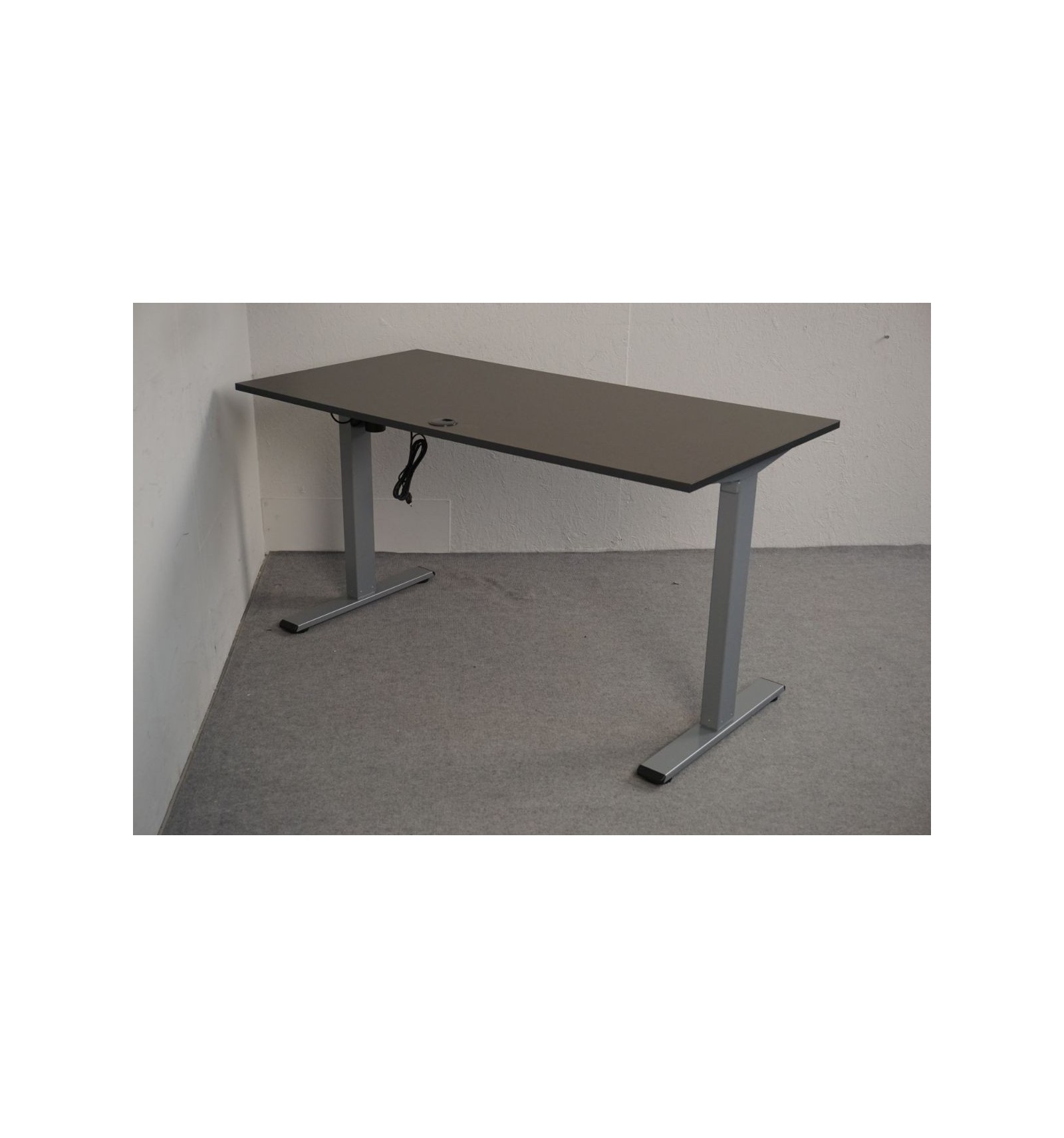 ekskl. momsNyt el hæve sænkebord med rektangulær bordplade i antracit. Dette skrivebord måler 140 x 70 cm. og har kabelhuller samt gråt 2-leddet stel.